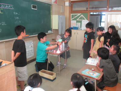 水を入れる人、入れた数を数える人、入れ物を押さえる人など
