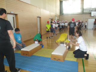 跳び箱運動の「台上前転」の説明を真剣に聞いていました。
